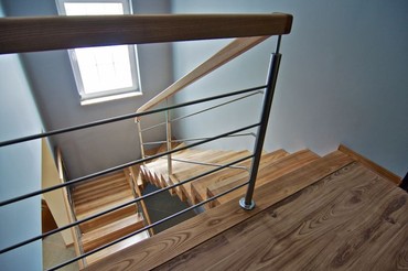 poręcz z drewna, wypełnienie stalowe, płaskowniki z rurkami