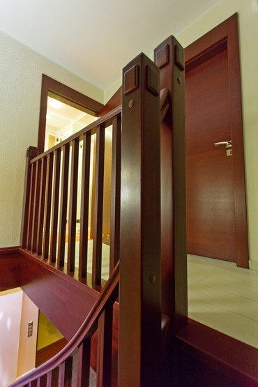 drewniana, wypełniona tralkami